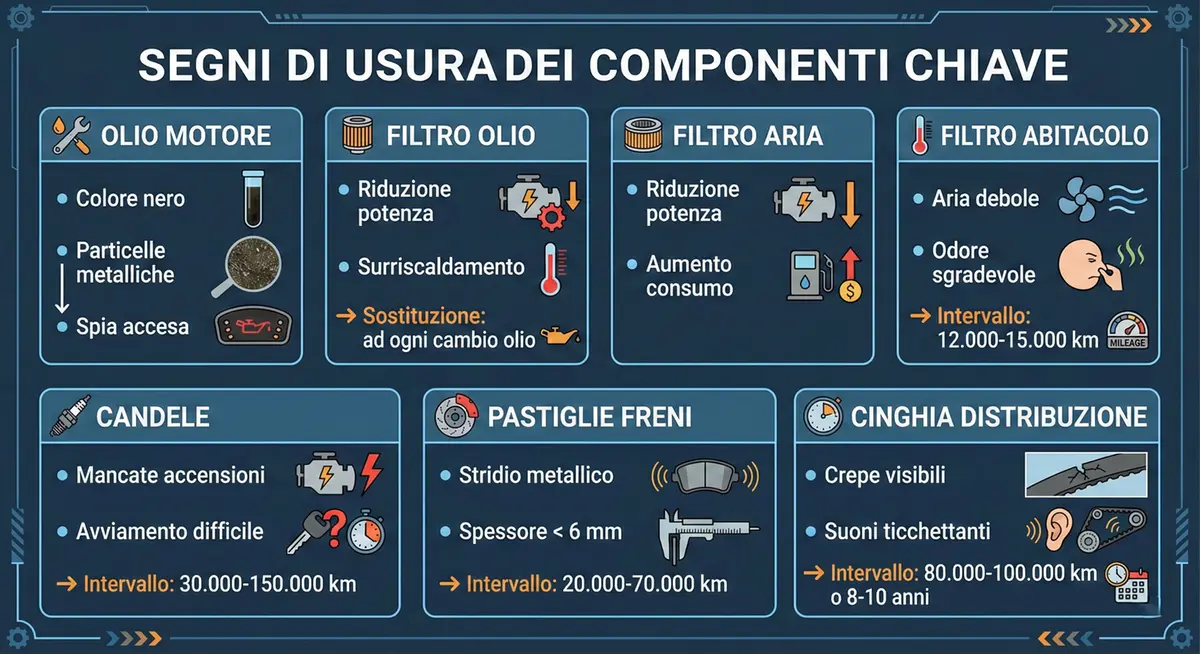 L'infografica illustra i sintomi di usura per sette componenti essenziali: olio motore (particelle metalliche visibili, spia accesa), filtro aria (riduzione potenza, aumento consumo), filtro abitacolo (aria debole, odore sgradevole), pastiglie freni (stridio metallico, spessore sotto 2-3 mm), candele (mancate accensioni, avviamento difficile) e cinghia distribuzione (crepe visibili, suoni ticchettanti). Ogni componente mostra gli intervalli di sostituzione raccomandati.