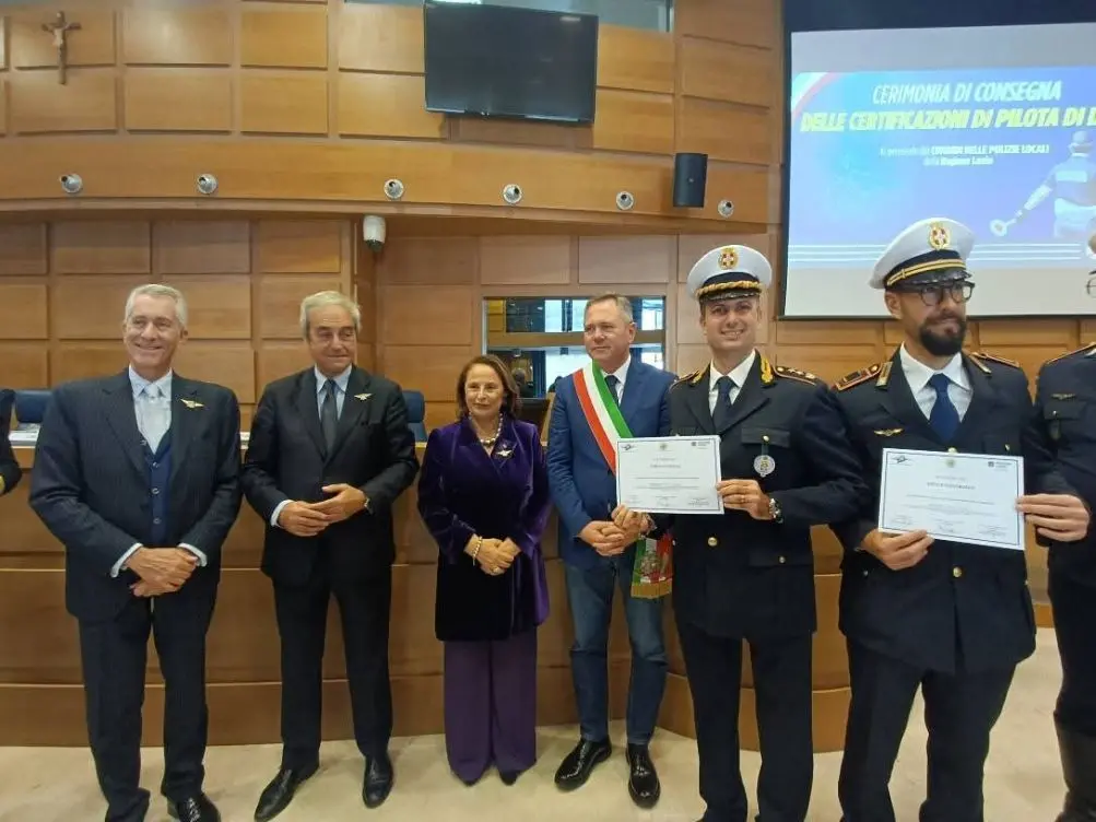 TARQUINIA - Consegnati gli attestati di abilitazione al volo di droni ai rappresentanti della Polizia locale di Tarquinia. All’iniziativa che si è svolta il 10 novembre presso la Regione Lazio erano presenti il sindaco Francesco Sposetti e l’assessora regionale alla Sicurezza, Politiche giovanili e Pari opportunità Luisa Regimenti. Sono stati premiati il comandante coordinatore Nicola Fortuna e il vice sovrintendente Gianfranco Felici, che hanno completato un corso della durata di circa otto mesi e mezzo, articolato in lezioni teoriche e pratiche. Il percorso formativo, insieme alla fornitura del drone, è stato realizzato grazie al finanziamento regionale ottenuto nell’ambito del bando “4.0 per le Polizie Locali”.