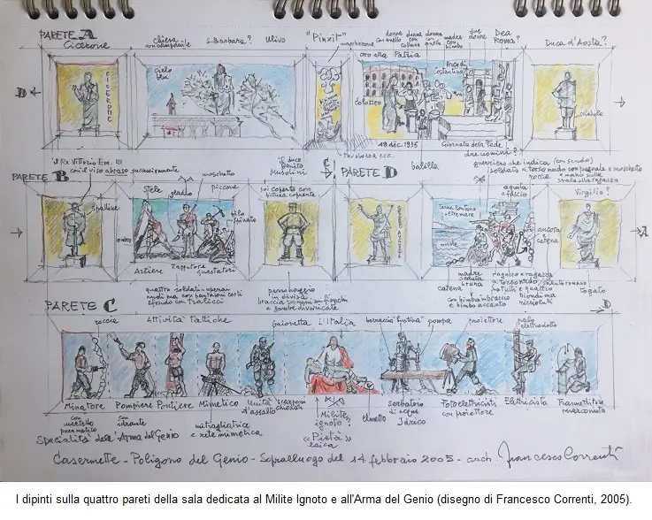 I dipinti delle Casermette, realizzati negli anni Trenta da due genieri, Boselli e Mastrangelo, rappresentano le specialità dell’Arma del Genio: pontieri, minatori, marconisti, guastatori. In uno dei due cicli, spicca una straordinaria “Pietà laica”, in cui la Madre Patria sostiene il corpo del Milite Ignoto avvolto nel Tricolore. Un unicum nel panorama artistico militare italiano, oggi esposto a infiltrazioni, crolli e all’incuria. «L’edificio – scriveva Correnti in un suo saggio – è in totale abbandono: porte e finestre murate, tetto crollato, pioggia che penetra. I dipinti, miracolosamente sopravvissuti, rischiano di sparire per sempre. Eppure appartengono alla collettività: sono un bene comune che la Repubblica tutela e valorizza ai sensi dell’articolo 9 della Costituzione. Abbiamo già perso troppo – ammonisce Correnti – la storia della città è fatta anche di muri, di segni, di arte minore che racconta il nostro passato. Se anche questi dipinti sparissero, non perderemmo solo delle pitture, ma un pezzo della storia cittadina».