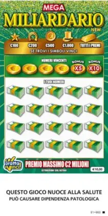«Il Gratta e vinci Mega Miliardario New, dal costo di 10 euro, mantiene la struttura classica della serie – spiega Agimeg - introducendo però i Bonus X5 e X10, che permettono di moltiplicare il premio associato ai numeri vincenti. Anche in questo caso, la presenza dei simboli speciali garantisce vincite immediate, mentre il Lingotto assegna tutti i premi dell’area di gioco. Il premio massimo previsto è di 2.000.000 di euro, proprio quello centrato a Tarquinia, con una gamma di premi intermedi che arriva fino a 500.000 euro». E’ bene ricordare che le percentuali di vincita in questo tipo di gioco sono statisticamente molto basse. Giova pertanto ricordare che il gioco d’azzardo può creare dipendenza patologica. In caso di perdita del controllo è importante rivolgersi ai servizi per le dipendenze (SerD) o ai centri specializzati.