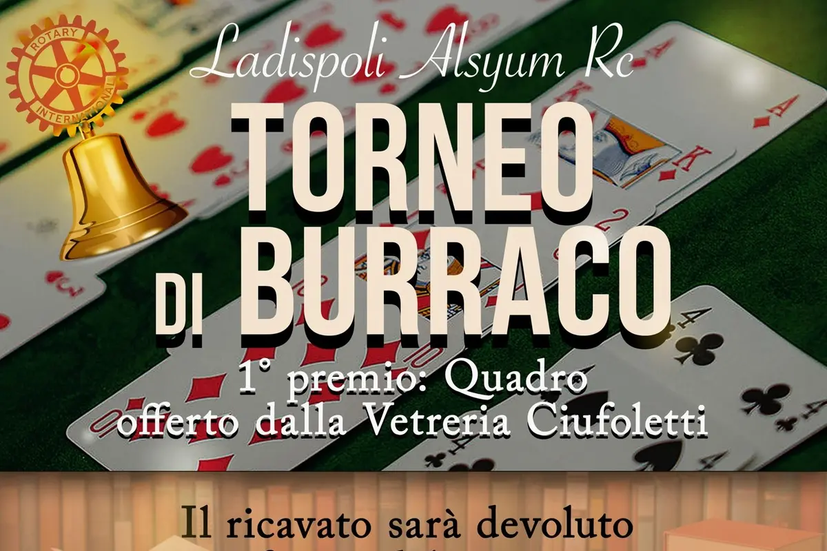 LADISPOLI - Primo evento di beneficienza del 2026 domenica prossima per il Rotary Club Ladispoli Alsyum. Dalle 15 in via Livorno 6 a Ladispoli prenderà il via il torneo di burraco. «Dopo la presentazione del libro di Roberta Spaccini, iniziativa per sostenere l’Admo, Associazione Italiana Donatori Midollo Osseo, e la raccolta fondi per la riapertura di pozzi in Burkina Faso, apriamo il 2026 con una iniziativa a favore del territorio – spiega Marìka Paris, presidente del Rotary Club Ladispoli Alsyum – con il torneo di burraco di domenica contiamo di raccogliere fondi per il progetto a sostegno della lettura e della apertura delle biblioteche nelle carceri». Per partecipare non occorre essere iscritti al Rotary Club, l’evento infatti è aperto a tutti. «Sarà l’occasione per farci conoscere e fare del bene – prosegue la presidente Paris – la quota di partecipazione è di soli 10 euro, ed in palio c’è un bel quadro offerto dalla vetreria Ciufoletti, grazie ad una cara amica, Marisa Alessandrini, da poco entrata nel nostro club».
