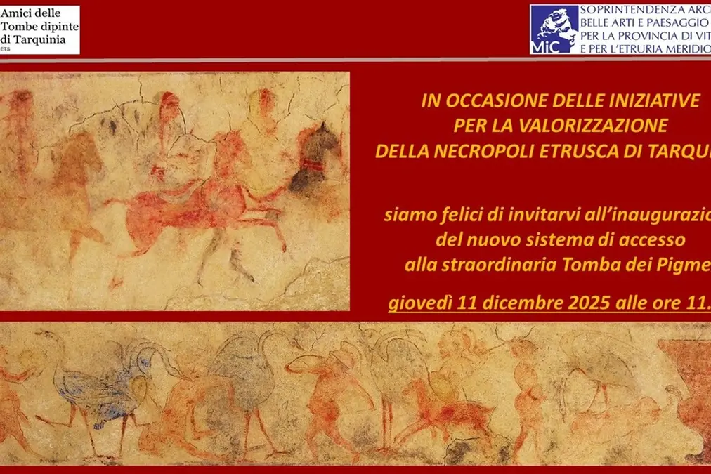TARQUINIA - L’associazione Amici delle Tombe di Tarquinia, in collaborazione con la Soprintendenza per la provincia di Viterbo e per l’Etruria meridionale, in occasione delle iniziative per la valorizzazione della Necropoli etrusca di Tarquinia, ha organizzato per giovedì 11 dicembre prossimo, l'inaugurazione del nuovo sistema di accesso alla straordinaria Tomba dei Pigmei, realizzato grazie al generoso contributo della Socia Federica Wiel Marin e, fino ad oggi, difficilmente accessibile a causa del lungo e ripido dromos. L’appuntamento è alle ore 11 al parcheggio della Tomba dei Tori. L’ingresso sarà contingentato e gratuito, senza obbligo di prenotazione. Alla fine è previsto anche un brindisi per festeggiare l’evento: un importante intervento volto a garantire una maggiore fruibilità e accessibilità di un sito così prestigioso.