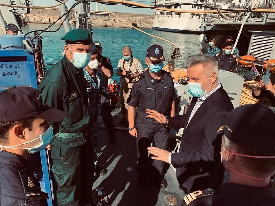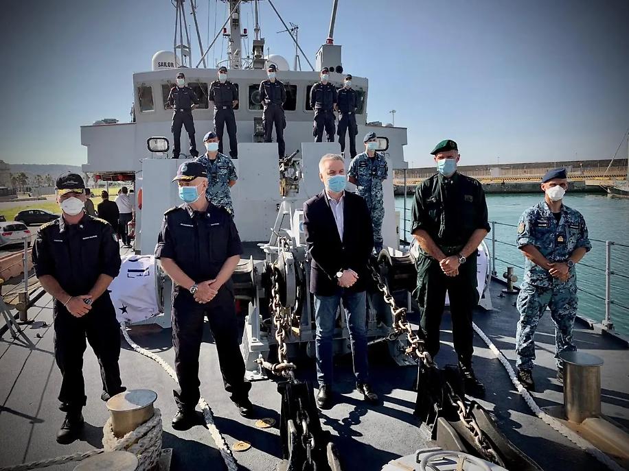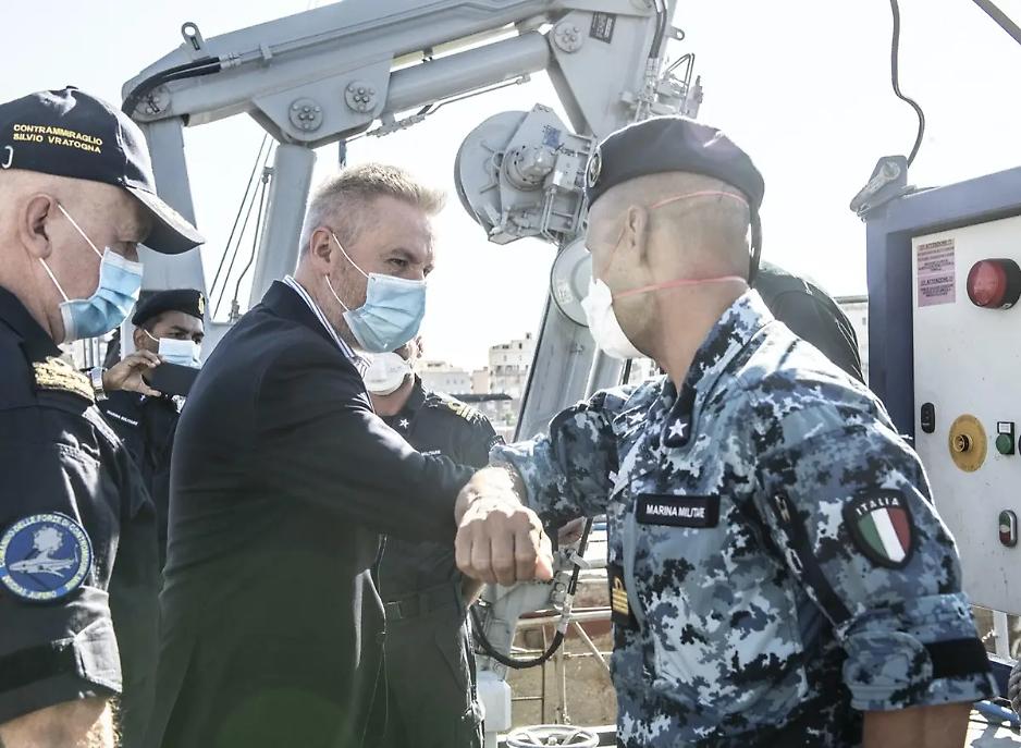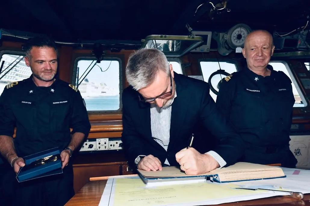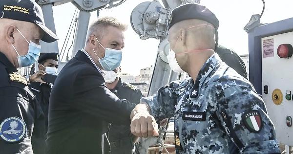 Il ministro Guerini in visita al porto di Civitavecchia saluta l'equipaggio del Cacciamine Numana