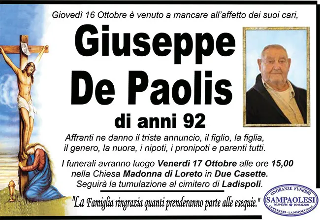 Home page>Necrologi>GIUSEPPE DE PAOLIS di an...