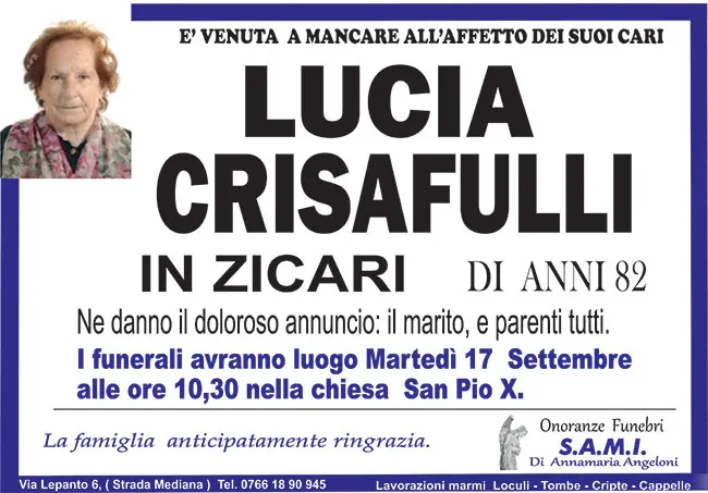 Home page>Necrologi>LUCIA CRISAFULLI in ZICA...