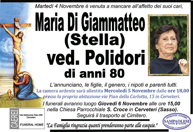NecrologiMARIA DI GIAMMATTEO (STELLA) ved. POLIDORI di anni 805 novembre, 2025 • 11:16Comuni:Cerveteri