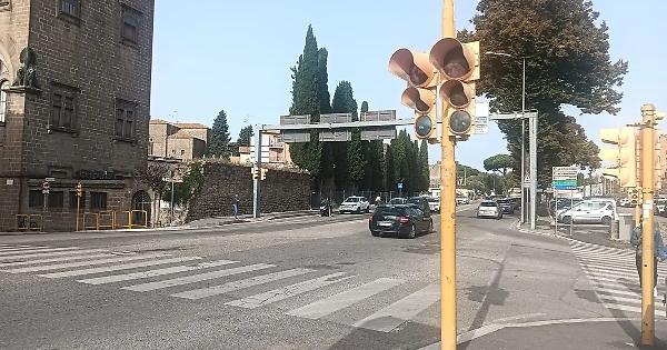 Semaforo dell’intersezione tra viale Raniero Capocci, sottopassaggio di via Vicenza e via Fratelli Rosselli: molti utenti della strada e pedoni sollevano critiche.