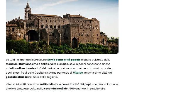Tra le dieci mete turistiche da visitare durante il 2025 c'è anche Viterbo. Il capoluogo della Tuscia è stato infatti inserito nell'elenco stilato ogni anno da Visit Italy, community da un milione e mezzo di follower su Instagram registrati nel 2024 e con una community online di 3,1 milioni di appassionati. «I tempi cambiano, e con loro mutano anche i gusti, le esigenze e i desideri dei viaggiatori di tutto il mondo, che oggi più che mai trovano nella vacanza un’occasione speciale alla ricerca di esperienze uniche da vivere e ricordare – si legge sul portale di Visit Italy -. Non c’è dunque da stupirsi se tantissimi turisti in viaggio per l’Italia ogni giorno desiderano scoprire destinazioni poco conosciute e frequentate, ad esempio città minori ricche di storia, arte e cultura come Viterbo».