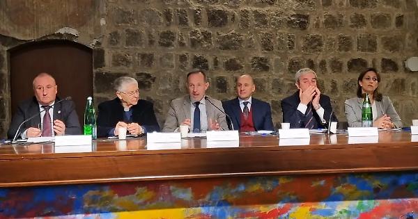 Focus poi sulle finalità del progetto. «Valorizzare le eccellenze agroalimentari del territorio associandole ai percorsi religiosi in un'esperienza che unisce il gusto dei prodotti tipici alla scoperta dei sentieri di fede». Un progetto che per Massimiliano Raffa, commissario straordinario Arsial, mira a creare «una proposta di sviluppo sostenibile che vada oltre l’eccezionalità dell'anno giubilare, per diventare strutturale. Con l’obiettivo di valorizzare il territorio integrando le tradizioni locali con un’offerta turistica permanente». A tale proposito ha annunciato che «da marzo inizieremo le attività sul territorio promuovendo incontri con sindaci e rappresentanti di enti e del mondo produttivo». Dodici gli eventi programmati da marzo a dicembre che si terranno in vari paesi delle province laziali. Con inizio il 21 marzo a Subiaco «la città di San Benedetto, patrono d’Europa» ha sottolineato l’assessore Righini. Due gli appuntamenti scelti nella Tuscia: il 18 maggio ad Acquapendente per la festa della Madonna del fiore e il 3 settembre a Viterbo per la festa di Santa Rosa. L’intervento del vescovo Orazio Francesco Piazza si incentra sulla speranza che «deve essere declinata in vari livelli per realizzare un progetto di vita e di sviluppo realistico». Perché «lo spirito giubilare non è una realtà astratta ma si incarna in persone concrete. Il Giubileo crea strutture progettuali, crea sentieri per il futuro. Dobbiamo camminare insieme in questo percorso che deve fondarsi su tre elementi: la persona, l’economia e l’ambiente». Giulio Menegali Zelli Iacobuzi, presidente commissione regionale Agricoltura e Ambiente, evidenziando che «questo progetto, essendo la provincia di Viterbo a vocazione agricola, incentrato su fede, tradizione e gastronomia è un'importante occasione di promozione delle nostre eccellenze» ha auspicato che «questa progettualità non sia limitata al solo anno giubilare». «Abbiamo di fronte un anno straordinario, il Giubileo è un’occasione da non perdere. 30 milioni di pellegrini, oltre 273 le opere previste per il Giubileo. Dati che possono aiutare il mondo imprenditoriale. Ci sono le condizioni e i dati sono buoni. Oggi per vincere la scommessa del far girare l'economia serve smetterla con i campanilismi e fare rete» ha esortato il consigliere regionale Giorgio Simeoni, presidente commissione speciale Giubileo. E per Maria Chiara Iannarelli, consigliera regionale e vice presidente commissione Giubileo, «in questo progetto c’è tutto il patrimonio spirituale ed economico del Lazio. L’evento giubilare offre la possibilità di sviluppare un progetto di marketing per i territori e lascia strutture per il futuro». Tra i relatori era previsto anche Daniele Sabatini, capogruppo Fratelli d’Italia in Regione, costretto a dare forfait per influenza. In sala presenti Mauro Rotelli, presidente commissione Ambiente e Infrastrutture della Camera, Laura Allegrini e Gianluca Grancini, rispettivamente capogruppo e consigliere FdI in Comune, i sindaci di Bagnoregio Luca Profili e di Valentano Stefano Bigiotti, il direttore generale Asl Egisto Bianconi e il commissario Ater Diego Bacchiocchi, al quale l'assessore Righini ha anticipato la nomina a direttore dell’azienda per l’edilizia residenziale. E, tra gli altri, Domenico Merlani e Francesco Monzillo, presidente e segretario Camera di commercio, il presidente di Federalberghi Pier Luigi Balletti e il presidente di Confesercenti Vincenzo Peparello.