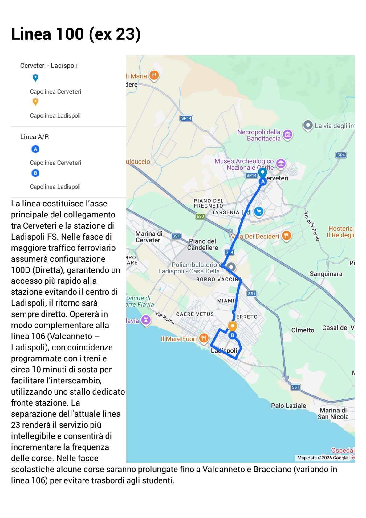 Nel piano si punta alla riduzione dello spreco chilometrico attualmente registrato, aveva spiegato Donati. Riflettori puntati su collegamenti diretti da e verso tutti i principali poli attrattori del territorio. Tra questi, assume particolare rilevanza il poliambulatorio di Ladispoli, che verrebbe servito con collegamenti dedicati sia da Cerveteri che da Cerenova e la rapidità con la quale gli utenti di Ladispoli raggiungeranno le proprie destinazioni senza gli attuali giri inutili».