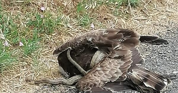 Avvicinandosi con prudenza, hanno capito che si trattava di un falco avvinghiato da un serpente di colore verde.