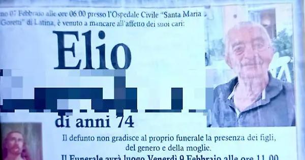 E’ la storia del signor Elio, deceduto all’età di 74 anni all’ospedale Santa Maria Goretti di Latina. L’uomo, originario di un paesino della Tuscia, Faleria, esprimendo la sua ultima volontà ha lasciato attoniti i concittadini. L’anziano, infatti, ha fatto mettere per iscritto sui manifesti funebri il messaggio che segue: «Il defunto non gradisce al proprio funerale la presenza dei figli, del genero e della moglie». L’uomo ha quindi messo nero su bianco e a chiare lettere la sua ultima richiesta, alimentando il dibattito rispetto ai motivi che si celano dietro questa drastica decisione, al momento sconosciuti. L’agenzia funebre di Aprilia, incaricata dei suoi funerali, ha però rispettato la sua volontà senza esitazione. I manifesti sono stati affissi per il paese, dando voce all’ultimo desiderio del defunto.