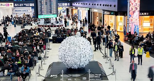 FIUMICINO - Un invito a passeggeri e comunità aeroportuale a fermarsi e a ripensare agli errori commessi nella propria vita, con la consapevolezza che questi rappresentino ingredienti preziosi di ogni esperienza: questo il messaggio proposto dall’opera “Master of Mistakes”, esposta da ieri presso la Piazza del Terminal 1 del “Leonardo da Vinci”, realizzata dall’artista romano Daniele Sigalot. La nuova proposta, dopo essere stata esposta presso la Galleria Nazionale d’ Arte Moderna è stata presentata questa mattina nel corso di una cerimonia, alla presenza dell’Amministratore Delegato di Aeroporti di Roma Marco Troncone, del Presidente della Commissione Cultura della Camera dei Deputati Federico Mollicone, dell’Assessore al Turismo, Sport, Cultura, Giubileo, Lavoro e Formazione Professionale del Comune di Fiumicino Federica Poggio, dell’Assessore al Commercio e Attività Produttive del Comune di Fiumicino Raffaello Biselli e del Presidente di Cultura Italiae Angelo Argento. “Master of Mistakes” è una scultura sferica del diametro di circa 300cm composta da centinaia di fogli d’alluminio che formano un planisfero dinamico in cui gli elementi ricreano la proiezione fisica di un doppio terrestre. `In questo modo, un singolo oggetto in equilibrio statico narra il valore collettivo del pensiero civico. L'opera diventa l'occasione di autoanalisi che si rivolge anche al pubblico, come accade in altri lavori di Daniele Sigalot, specializzato nel muoversi sull'ambiguità dei materiali.