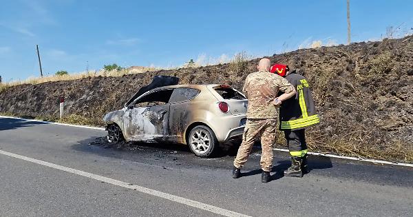Per cause in corso d’accertamento la vettura, un’Alfa Romeo, si è incendiata e le fiamme si sono propagate in breve tempo a un campo di grano che costeggia la strada.