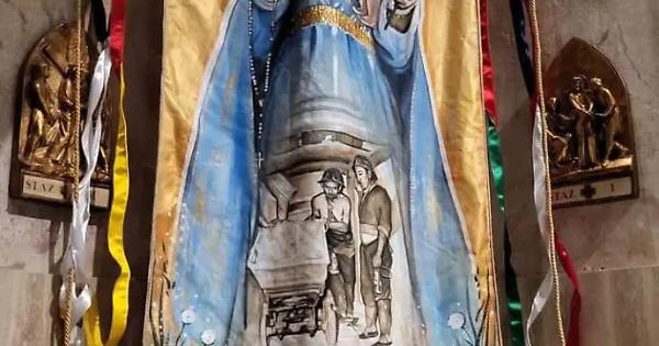 Nel Cencio è possibile vedere la Madonna delle Grazie che amorevolmente protegge dall'alto due Minatori che faticosamente spingono un carrello pieno di alunite. Questa parte artistica riprende una foto degli ultimi Minatori che negli anni '50 ancora lavoravano nelle miniere di Allumiere. Sotto sei rose, simbolo passionale e ardente come la cieca fede dei contradaioli, con i colori delle sei Contrade, signore indiscusse del nostro Palio. Il Cencio rimarrà nella chiesa della SS Maria Assunta in Cielo dove i contradaioli potranno pregare ed ammirare l'opera che unisce sacro e profano.