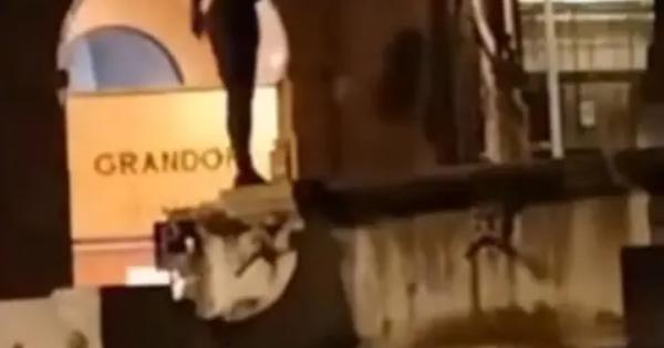 Un uomo, di origini straniere, sale sulla fontana di piazza della Rocca. Prima si bagna la testa sotto una delle cannelle, poi in piedi fa il giro del monumento, pare in equilibrio lungo il bordo della vasca, quindi saltellando scende.