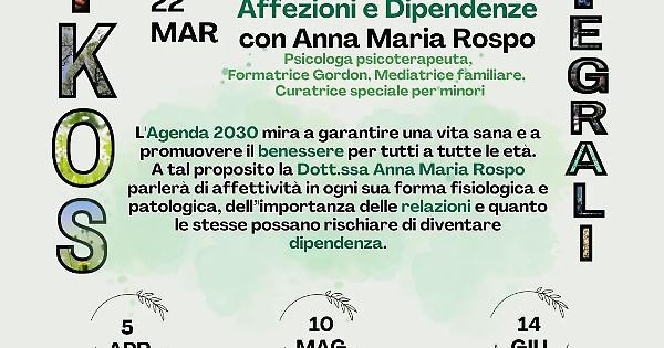 «L'Agenda 2030 promuove, tra i vari aspetti, il benessere fisico e psicologico per tutte le fasce d'età - spiegano gli organizzatori - Durante questo primo incontro, analizzeremo il tema delle dipendenze in tutte le loro forme, incluse quelle affettive».