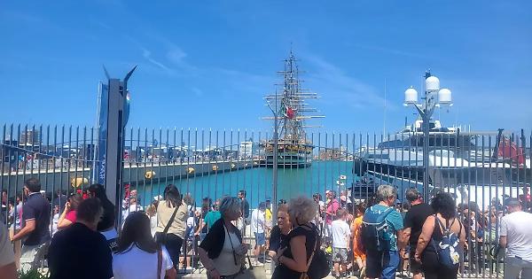 Specie quelle di ieri e di domenica, quando la nave più bella del mondo – come viene universalmente riconosciuta – ha catalizzato l’attenzione di migliaia di persone, in un crescendo di entusiasmo che ha trasformato il porto storico in un palcoscenico a cielo aperto. Le immagini parlano chiaro: lunghe, lunghissime file di visitatori in attesa di poter salire a bordo, molti dei quali arrivati da fuori città, attratti dalla fama della nave scuola della Marina Militare e dal richiamo del Tour mondiale. Sotto un sole estivo e impietoso, le persone hanno pazientemente atteso il proprio turno, mentre chi non è riuscito ad accedere si è sistemato lungo il molo del Bicchiere, cercando comunque di immortalare la Vespucci in uno scatto ricordo, da dietro i cancelli o dalla parte opposta della banchina.