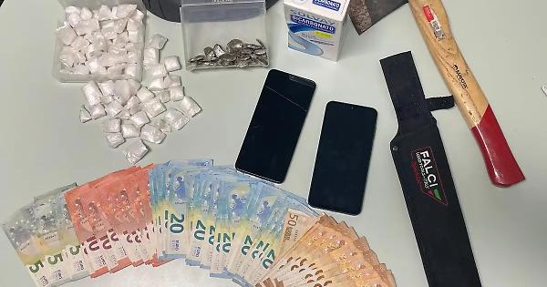 Il giovane straniero, gravato da precedenti di polizia e irregolare sul territorio italiano, è stato trovato in possesso di circa 100 grammi di cocaina e 40 grammi di hashish, suddivisi in dosi pronte per la vendita, oltre a un machete, un'accetta e materiale vario per il confezionamento, tutto sequestrato.
