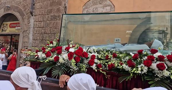 L’urna con Santa Rosa, trasportata dai facchini, ha fatto il suo ingresso ieri in piazza del Comune. Ad accoglierla una discreta folla di viterbesi e di visitatori. Un arrivo un po’ sottotono, senza alcuna musica, a causa di un problema tecnico, a sottolineare la straordinarietà dell’evento. Il 2 settembre infatti la città è abituata ad assistere al transito della reliquia del cuore della Santa, ma quest'anno per celebrare il Giubileo è stata concessa la possibilità di traslare il corpo.