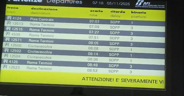• IC 501 Sestri Levante (4:53) - Napoli Centrale (12:29): il treno viaggia in ritardo e oggi è instradato tra Pisa a Roma via Firenze Rifredi e non ferma a Livorno Centrale, Cecina, Campiglia Marittima, Follonica, Grosseto, Orbetello, Civitavecchia e Roma Ostiense.