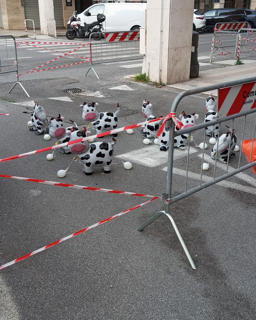 Sul Corso Marconi spunta un “pascolo” improvvisato, con tanto di mucche, per raccontare – con ironia – una situazione che ormai da troppo tempo esaspera residenti e commercianti dei portici. Nelle ultime ore, in un’area transennata, qualcuno ha posizionato una fila di mucche di plastica all’interno del recinto, come a trasformare l’ennesimo “cantiere immobile” in una piccola fattoria urbana. Una trovata semplice, ma efficace: le foto hanno iniziato a girare sui social e, insieme alle risate, sono arrivati anche i commenti più amari.
