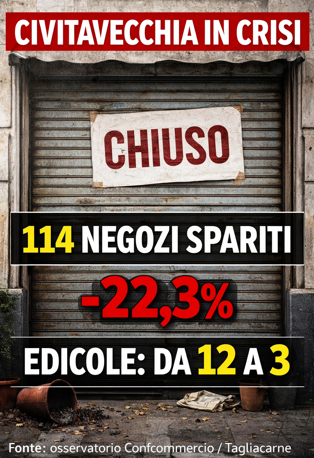 Nel centro storico di Civitavecchia, tra il 2012 e il 2025, sono sparite 114 imprese commerciali. Tradotto: il 22,3% delle attività. È il dato più duro contenuto nell’intervento diffuso da Tullio Nunzi, che richiama le elaborazioni dell’Osservatorio sulla demografia d’impresa di Confcommercio e del Centro studi Guglielmo Tagliacarne e chiede «interventi immediati e consistenti».