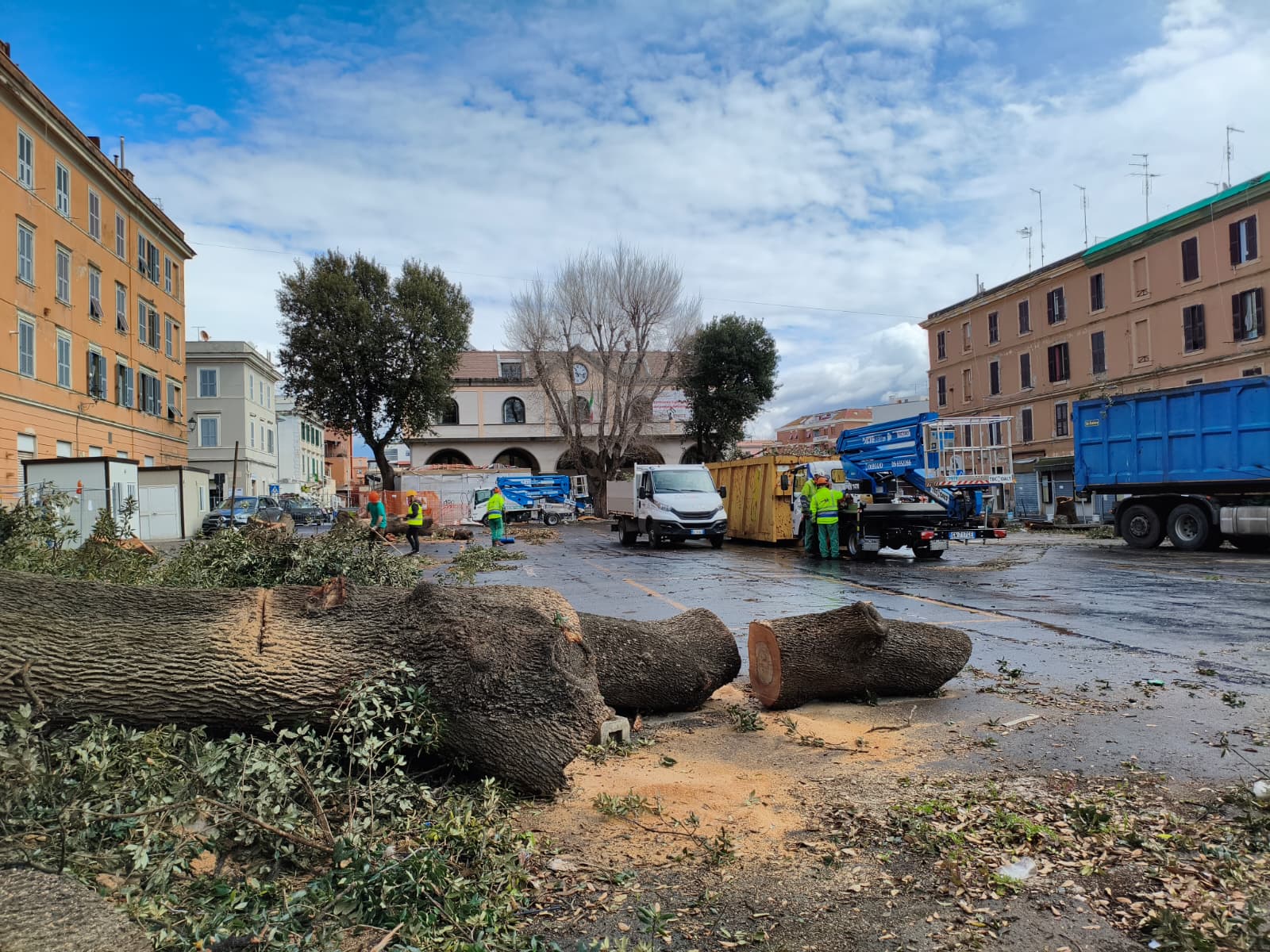 Oggi intanto, causa pioggia, le operazioni di abbattimento sono state messe in pausa ma la ditta ha continuato con la rimozione di tronchi e rami rimossi.