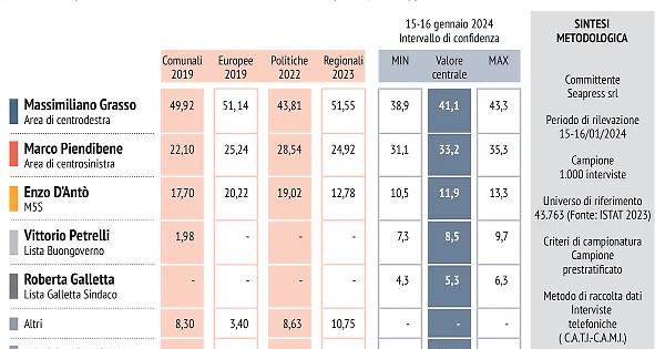 Ebbene, in una ipotesi di voto, al primo turno, uno dei possibili candidati sul tavolo del centrodestra, Massimiliano Grasso, potrebbe ottenere un 41,1%, seguito da Marco Piendibene per il centrosinistra al 33,2%. Enzo D’Antò di Movimento Cinque Stelle e Unione popolare all’11,9%, con Vittorio Petrelli della lista civica il Buongoverno all’8,5% e la civica Roberta Galletta al 5,3%. Lo scenario con Grasso e Piendibene è quello con i candidati risultati più forti tra quelli testati sui due schieramenti (Tedesco, De Sio e Poletti da una parte e Marietta Tidei dall’altra).