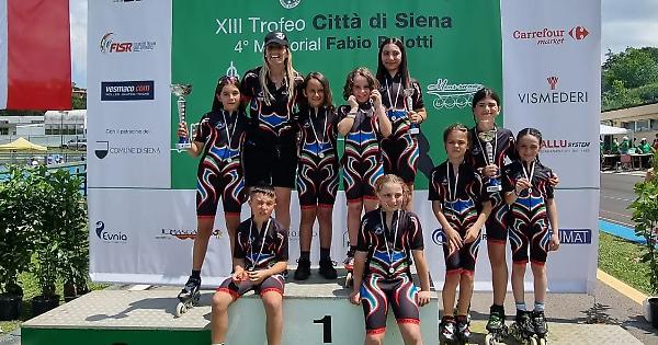 La Debby Roller Team, continua a mietere successi e questa volta i suoi atleti lo hanno fatto al XIV Trofeo nazionale Città di Siena della Federazione Italiana Sport Rotellistici, svolto il 2 giugno nel bellissimo pattinodromo “B.Tiezzi” di mt 200 a giro con superficie in resina, sito all’interno dell’impianto sportivo Acquacalda di Siena. In una giornata con meteo intermittente tra pioggia e sole, la Debby Roller Team continua a volare, questa volta al secondo posto, dietro la società locale, la grandissima Mens Sana di Siena su 52 società partecipanti. A brillare con una doppia vittoria delle due gare previste nella categoria Ragazzi (13-14 anni) è il neo Campione Italiano Simone Piccoli, che vince sia la mt 300 che la mt 3.000 a Punti. L’altra vittoria arriva nelle Ragazze 12 (12 anni) ancora una volta con Novella Cozzolino che vince la mt 2.000 a Punti e conquista un buon 3° posto nella mt 300. Nella stessa categoria su 51 avversarie, l’armata Debby conquista un 3° nella mt 2000 a Punti con Alice Beck, nella stessa gara un 5° posto con Laura Tatulli, un 7° con Siria Tallarico e un 12° con Daria Tallarico. Mentre nella stessa categoria ma nella mt 300, Alice Zorzi conquista la 4^ posizione in finale. L’altro grandissimo risultato arriva dalle più piccole ovvero la categoria Esordienti (10-11 anni) femminile su 62 concorrenti, Cristina Pilli vince la gara di Destrezza, e conquista un doppio argento nella 2 giri Sprint e nella 8 Giri in Linea, che viene seguita dalle sue 2 compagne di squadra Giorgia Cosman che conquista tre bronzi nelle rispettive 3 gare in programma. Ad un soffio dal podio l’altra Debbina, Valeria Princigalli che conquista la quarta posizione nella 2 giri Sprint. Strepitosa 5^ posizione su 52 avversarie, nella categoria Giovanissime (8-9 anni) per Flavia Crusco nella 5 Giri in Linea e meno di un anno di pattinaggio alle spalle.