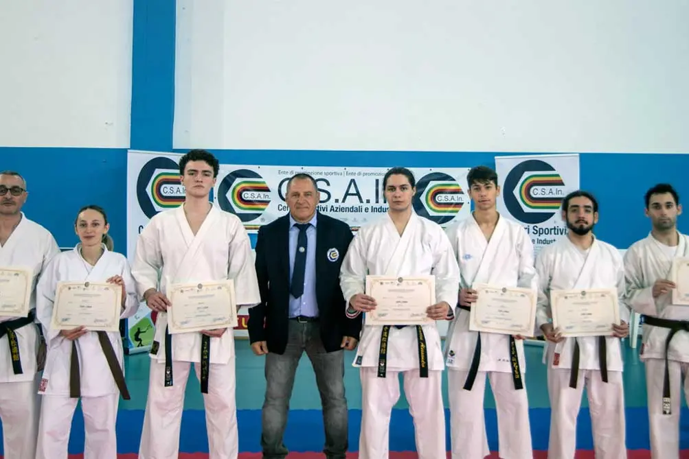 Nello scorso week-end , presso la palestra del palazzetto dello sport di Tuscania, si è svolta una significativa sessione di esami per il conseguimento della cintura nera organizzata dallo C. S. A. In. L'evento ha visto la partecipazione di oltre 25 atleti, provenienti da diverse fasce d'età, che hanno dimostrato impegno e dedizione. La commissione esaminatrice era composta da figure di spicco nel panorama del karate: il maestro Francesco Di Campli, direttore tecnico della Asd Ronin Kai K. S. Tuscania, il maestro Stefano Pioli e il maestro Christian Mecarozzi. L'intera sessione è stata condotta sotto la vigilanza attenta del maestro Marco Cocci, responsabile regionale del Lazio. La Ronin Kai ha presentato otto karateki, i quali sono stati tutti promossi con successo: Matteo Graziotti (1° dan), Alice Raspini (1° dan), Mirco Pieri (1° dan), Riccardo Paoletti (1° dan), Alessandro Mattei (2° dan), Gianmarco Oriolesi (2° dan), Patrick Celestini (2° dan) e Renato Nunzi (4° dan). Questo risultato testimonia non solo le abilità tecniche degli atleti, ma anche l’efficacia del lavoro di preparazione svolto nel corso del tempo. Il maestro Di Campli ha espresso grande soddisfazione per i risultati ottenuti dai suoi allievi. Per garantire la massima trasparenza durante lo svolgimento degli esami, egli ha scelto di astenersi dal valutare i propri atleti, delegando questo compito a un altro membro della commissione. Infine, il maestro Di Campli ha voluto esprimere un sentito ringraziamento a Pietro Moro per il supporto fornito nella preparazione logistica e nell’allestimento dello spazio all'interno del palazzetto dello sport di Tuscania, contribuendo così al buon esito dell’incontro. Questi successi rappresentano un importante traguardo per la Ronin Kai e un ulteriore stimolo per continuare a perseguire l’eccellenza nel karate.