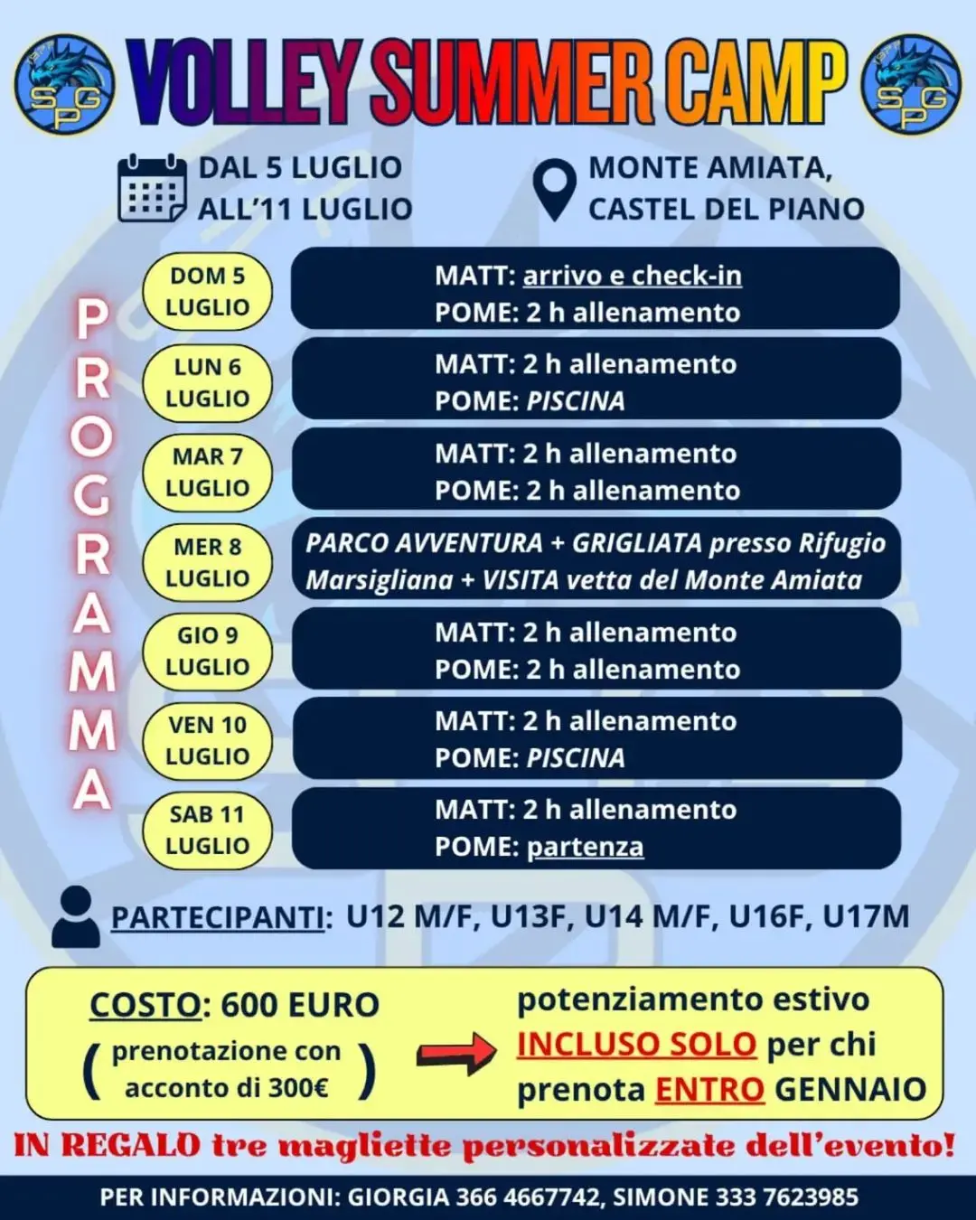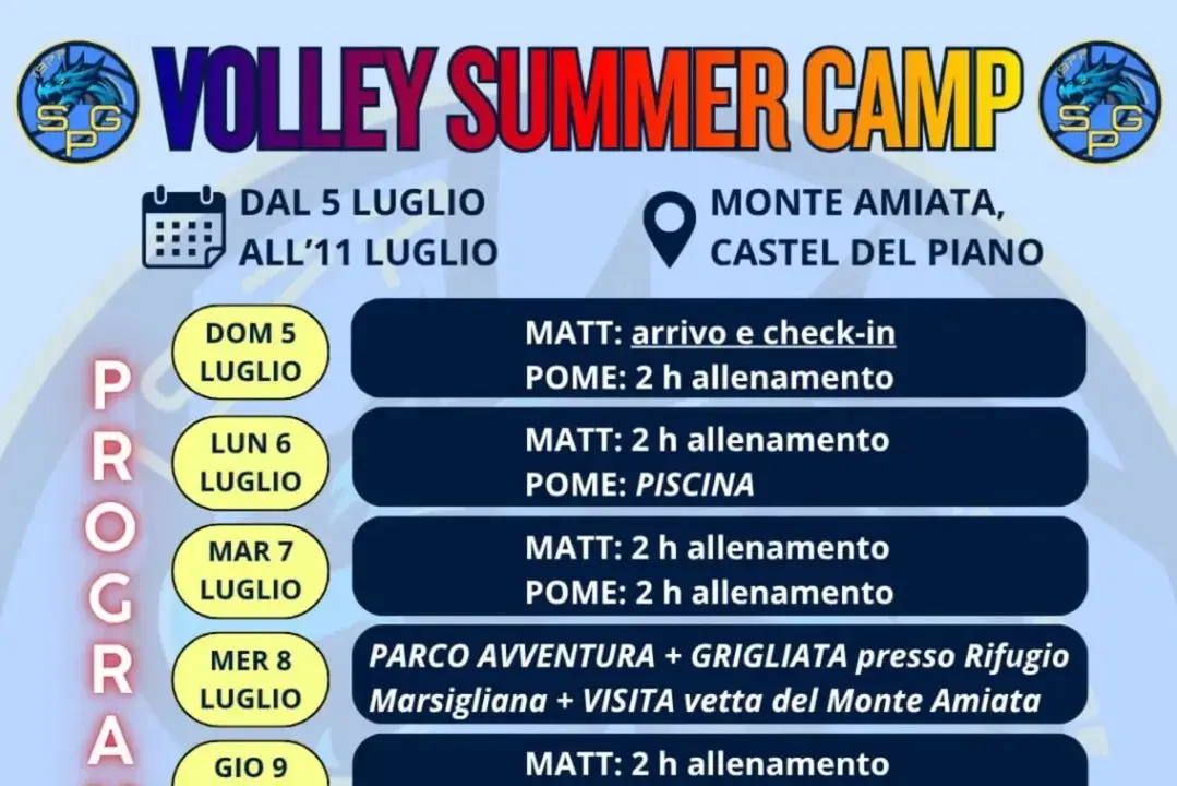 Dal 5 all’11 luglio 2026 il Monte Amiata diventa il cuore pulsante della pallavolo giovanile, con la prima edizione del Volley Summer Camp firmato San Giorgio. Quest'ultima, società pallavolistica fiumicinese, ha organizzato una settimana dedicata allo sport, alla natura e all’amicizia, pensata per regalare agli atleti un’esperienza indimenticabile e divertente. Il camp è aperto alle categorie Under 12 M/F, Under 13F, Under 14 M/F, Under 16F e Under 17M, unendo la formazione tecnica a momenti di svago immersi nel verde. I partecipanti alloggeranno in pensione completa presso l’Hotel Da Venerio di Castel del Piano, a pochi minuti dagli impianti sportivi di via Campo Grande, dove si terranno gli allenamenti quotidiani guidati dallo staff della società. Non mancheranno di certo le attività extra, dai pomeriggi di relax alle piscine del Campo di Sole, ad un’adrenalinica giornata al Parco Avventura Indiana Park Amiata. Concludendo poi, con un’emozionante escursione in vetta al Monte Amiata accompagnati da una guida esperta. Il costo del camp è di 600 euro, con prenotazione tramite acconto pari all'esatta metà dell'importo. Per chi vorrà iscriversi entro gennaio, potrà usufruire del potenziamento estivo gratuito, un’occasione in più per migliorare le proprie capacità tecniche e fisiche. Per maggiori informazioni è possibile contattare Giorgia al numero 366 4667742 o Simone al 333 7623985.