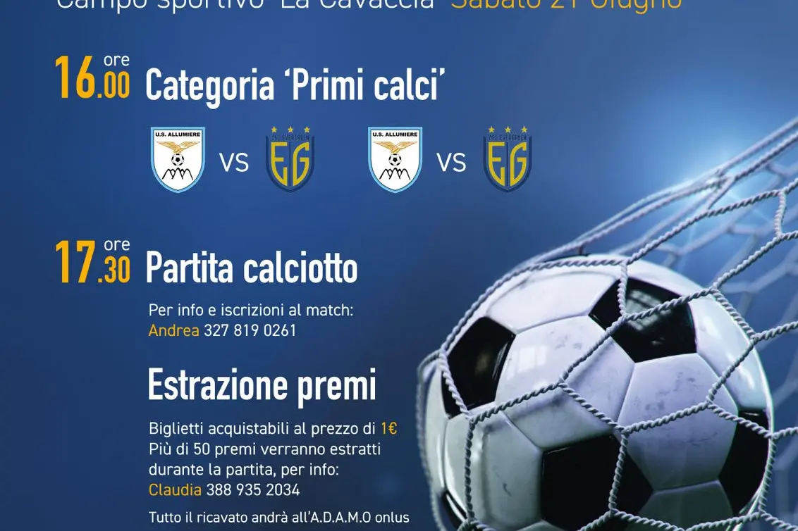 Via alle 16, quando ci saranno delle esibizioni dei bambini della categoria Primi Calci di Allumiere ed Evergreen. Alle 17.30 il programma prevede una partita di calciotto tra gli amici di Tomaso. Chi vuole, può partecipare telefonando ad Andrea al 3278190261. È prevista anche l’estrazione di premi, tramite i biglietti che sono acquistabili al modico costo di un euro. Più di 50 premi verranno estratti nel corso della partita di calciotto. Per informazioni si può contattare Claudia al 3889352034. L’intero incasso della manifestazione verrà devoluto all’Adamo Onlus.